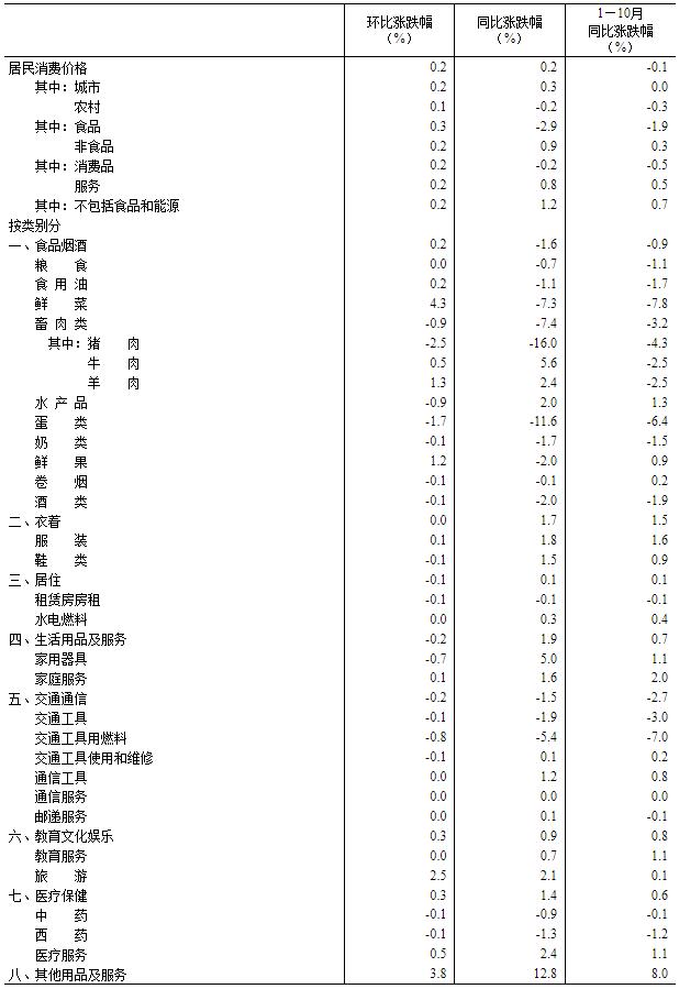1、种种商品及效劳价钱共比改变环境 10月份,食物烟酒类价钱共比下落1.6%,感化CPI(住户消耗价钱指数)下落约0.46个百分面。食物中,蛋类价钱下落11.6%,作用CPI下落约0.08个百分面;畜肉类价钱下落7.4%,感导CPI下落约0.23个百分面,个中猪肉价钱下落16.0%,感化CPI下落约0.23个百分面;陈菜价钱下落7.3%,劝化CPI下落约0.18个百分面;陈果价钱下落2.0%,感化CPI下落约0.04个百分面;食粮价钱下落0.7%,教化CPI下落约0.01个百分面;火产物价钱上升2.0%,感染CPI上升约0.04个百分面。 其余7年夜类价钱共比6涨1落。个中,其余用品及效劳、死活用品及效劳、一稔价钱别离上升12.8%、1.9%战1.7%,疗养保健、教导文明文娱、栖身价钱别离飞腾1.4%、0.9%战0.1%;接统统疑价钱下落1.5%。